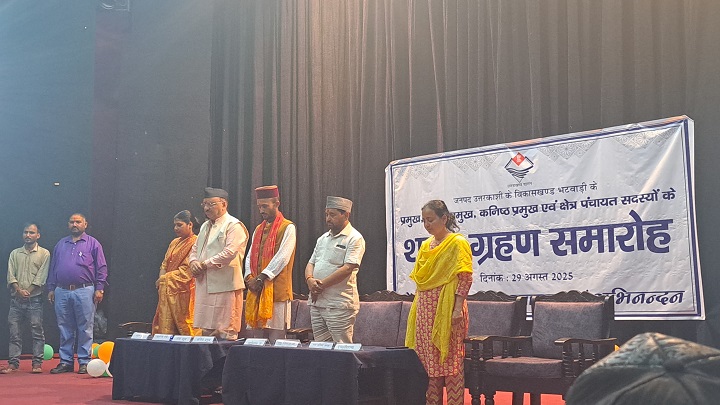 जिला कलेक्ट्रेट ऑडिटोरियम हॉल में शुक्रवार को भटवाड़ी और डुंडा विकासखंडों के नवनिर्वाचित ब्लॉक प्रमुखों के शपथ ग्रहण समारोह धूमधाम से संपन्न हुए। इस अवसर पर मुख्य अतिथि के रूप में गंगोत्री विधायक सुरेश सिंह चौहान मौजूद रहे। कार्यक्रम की शुरुआत धराली आपदा में हताहत हुए लोगों को भावपूर्ण श्रद्धांजलि देने के साथ हुई। इसके उपरांत भटवाड़ी ब्लॉक प्रमुख ममता पंवार ने ज्येष्ठ प्रमुख, कनिष्ठ प्रमुख और सभी क्षेत्र पंचायत सदस्यों के साथ शपथ ग्रहण किया। विधायक चौहान ने ममता पंवार को पुष्पगुच्छ भेंट कर बधाई और शुभकामनाएँ दीं।
