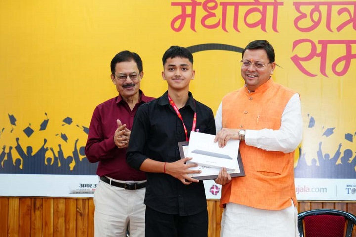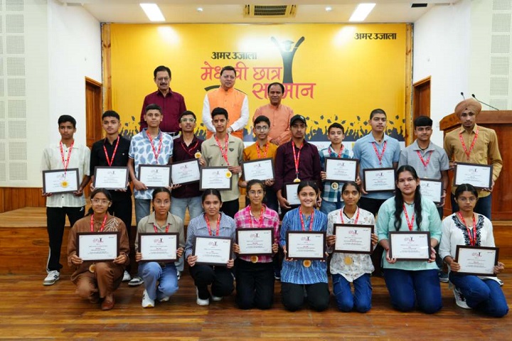 मुख्यमंत्री पुष्कर सिंह धामी ने मंगलवार को मुख्यमंत्री आवास स्थित मुख्य सेवक सदन में मेधावी छात्र सम्मान समारोह में उत्तराखण्ड माध्यमिक शिक्षा बोर्ड के हाईस्कूल और इण्टरमीडिएट के 75 मेधावी छात्र-छात्राओं को सम्मानित किया। अमर उजाला समाचार पत्र द्वारा आयोजित कार्यक्रम में मुख्यमंत्री ने कहा कि इस सम्मान समारोह के माध्यम से अमर उजाला प्रतिवर्ष हमारे राज्य के प्रतिभावान छात्रों को सम्मानित कर उनका उत्साहवर्धन कर रहा है। मुख्यमंत्री ने कहा कि सम्मानित हो रहे सभी प्रतिभाशाली विद्यार्थी राज्य के उज्ज्वल भविष्य की नींव हैं। अपने माता-पिता, शिक्षकों और विद्यालय के साथ ही इन विद्यार्थियों ने उत्तराखंड का मान भी बढ़ाया है। प्रदेश की शिक्षा व्यवस्था को बेहतर बनाने के लिए सरकार निरतंर प्रयासरत है।