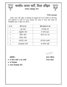 वरिष्ठ नेतृत्व के परामर्श से हुई घोषणा भाजपा जिला हरिद्वार के जिलाध्यक्ष श्री आशुतोष शर्मा की सहमति एवं मंडल के वरिष्ठ पदाधिकारियों से परामर्श के पश्चात मंडल अध्यक्ष श्री वरुण वशिष्ठ द्वारा आधिकारिक सूची जारी की गई।