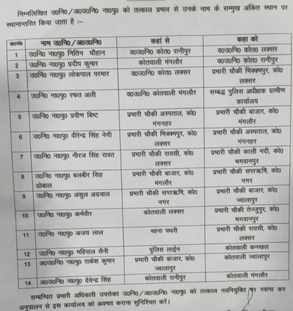 तबादला सूची के अनुसार कई अधिकारियों को कोतवाली रानीपुर, लक्सर, मंगलौर, ज्वालापुर, भगवानपुर सहित विभिन्न कोतवालियों एवं चौकियों में नई जिम्मेदारियां सौंपी गई हैं। कुछ अधिकारियों को प्रभारी चौकी के रूप में तैनाती दी गई है, जबकि कुछ को कोतवाली एवं पुलिस लाइन से संबंधित पदस्थापना मिली है।