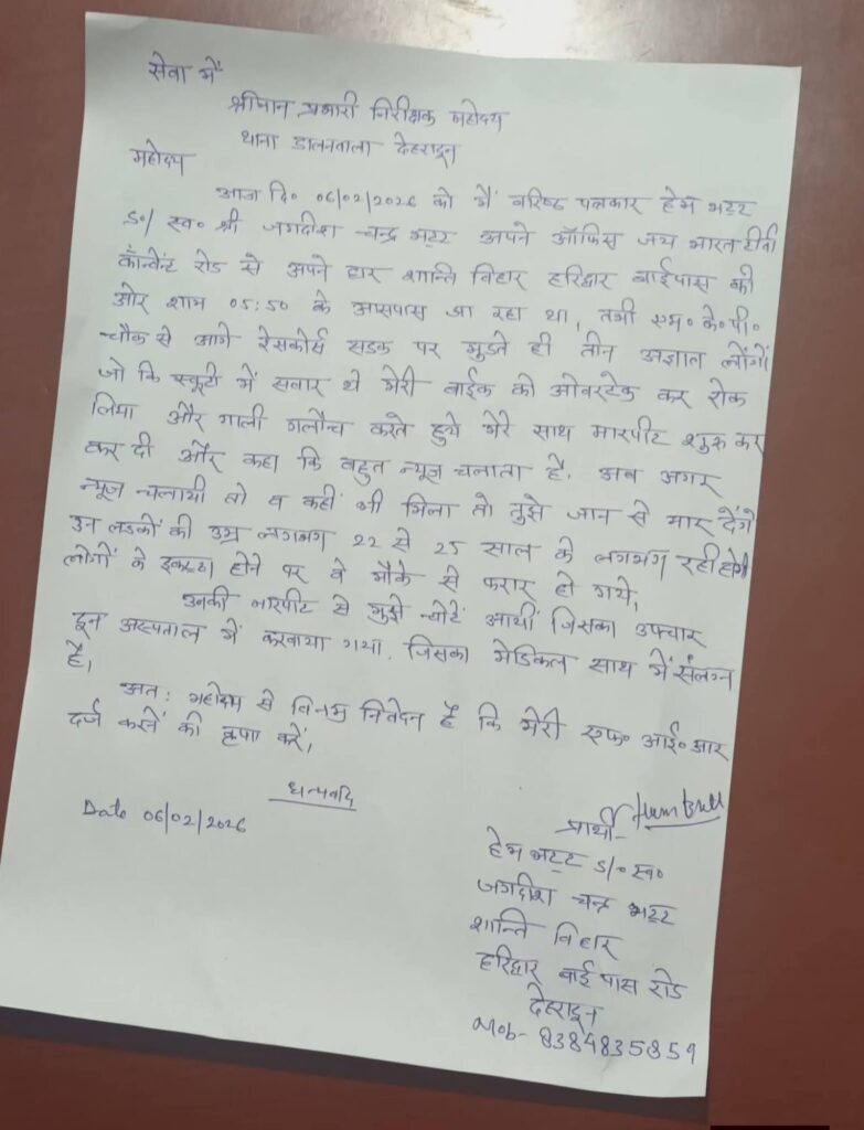 देहरादून। राजधानी देहरादून में कानून व्यवस्था को लेकर एक बार फिर गंभीर सवाल खड़े हो गए हैं। वरिष्ठ पत्रकार हेम भट्ट पर सरेआम हुए जानलेवा हमले ने न सिर्फ पत्रकार जगत को झकझोर दिया है, बल्कि आम नागरिकों में भी भय और असुरक्षा की भावना पैदा कर दी है। व्यस्त इलाके में दिनदहाड़े हुए इस हमले से अपराधियों के बढ़ते हौसले साफ झलकते हैं।