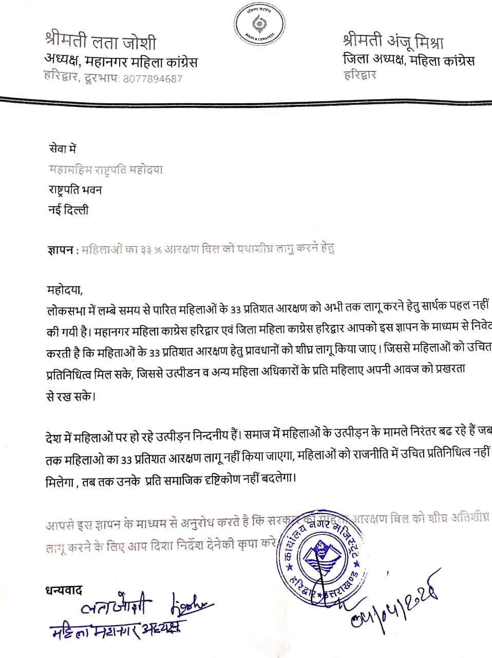 poltical news in haridwar महामहिम राष्ट्रपति को प्रेषित ज्ञापन में उन्होंने कहा कि लोकसभा में लम्बे समय से पारित महिलाओं के 33 प्रतिशत आरक्षण को अभी तक लागू करने हेतु सार्थक पहल नहीं की गयी है। महानगर महिला काग्रेस हरिद्वार एवं जिला महिला काग्रेस हरिद्वार आपको ज्ञापन के माध्यम से निवेदन करती है कि महिताओं के 33 प्रतिशत आरक्षण हेतु प्रावधानों को शीघ्र लागू किया जाए। जिससे महिलाओं को उचित प्रतिनिधित्व मिल सके और उत्पीडन व अन्य महिला अधिकारों के प्रति महिलाए अपनी आवज को प्रखरता से रख सके। देश में महिलाओं पर हो रहे उत्पीड़न निन्दनीय हैं। समाज में महिलाओं के उत्पीड़न के मामले निरंतर बढ रहे हैं। जब तक महिलाओं को 33 प्रतिशत आरक्षण लागू नहीं किया जाएगा, महिलाओं को राजनीति में उचित प्रतिनिधित्व नहीं मिलेगा, तब तक उनके प्रति समाजिक दृष्टिकोण नहीं बदलेगा। poltical news in haridwar