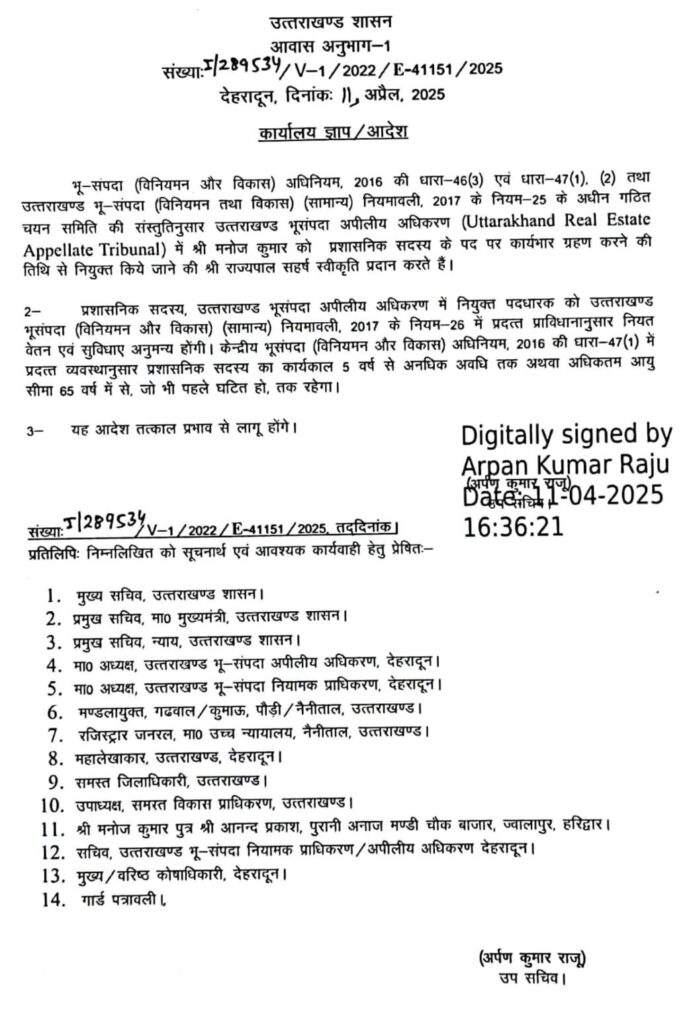 उत्तराखंड शासन के उपसचिव अर्पण कुमार राजू द्वारा जारी आदेश में उन्होंने भू – संपदा (विनियमन और विकास) अधिनियम, 2016 की धारा-46 (3) एवं धारा-47 (1), (2) तथा उत्तराखण्ड भू-संपदा (विनियमन तथा विकास) (सामान्य) नियमावली, 2017 के नियम 25 के अधीन गठित चयन समिति की संस्तुतिनुसार उत्तराखण्ड भूसंपदा अपीलीय अधिकरण (Uttarakhand Real Estate Appellate Tribunal) में श्री मनोज कुमार को प्रशासनिक सदस्य के पद पर कार्यभार ग्रहण करने की तिथि से नियुक्त किये जाने की श्री राज्यपाल सहर्ष स्वीकृति प्रदान करते हैं।
